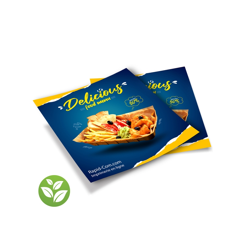12 cm x 12 cm, le format carré de la taille d'un CD. format moderne et passe-partout : boîtes aux lettres, pare-brise de voiture... . Grace à son format standard, le Flyer carré se niche partout !! Vous pourrez également l 'imprimer sur un grammage léger : 135g comme sur grammage très épais : 350g. Nous proposons également des papiers écologiques, climatiquement neutre, pour l'environnement.